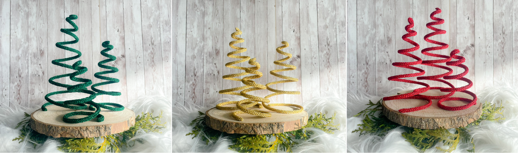 Jsou inspirované tvary klasických vánočních stromků, ale pojaté v moderní minimalistické podobě — lehké spirály z dutinkového pletení, tvarované do elegantních linií, které v interiéru působí jemně a hřejivě.